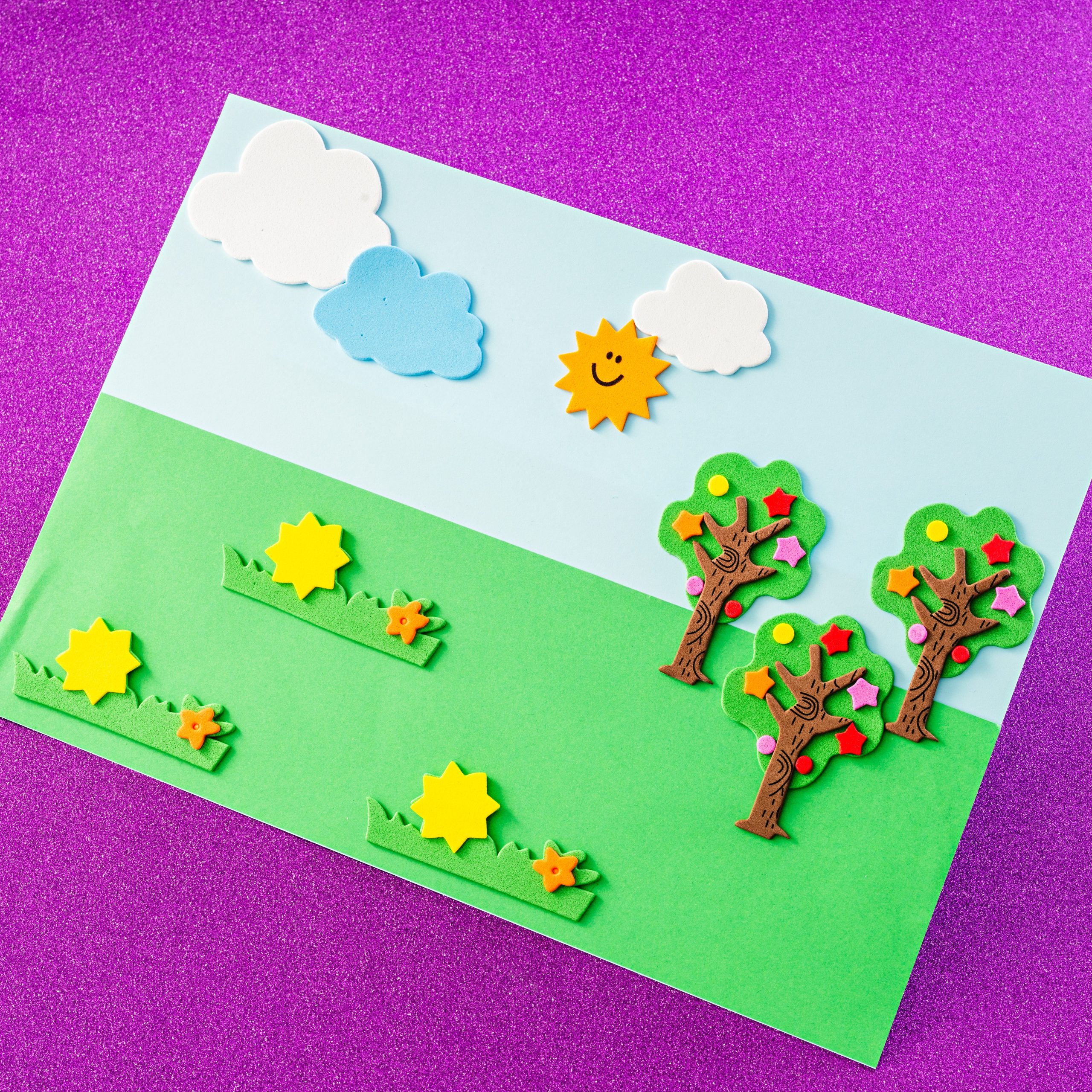 Ușor de realizat și foarte atractiv, acest colaj este ideal atât pentru acasă, cât și pentru activități educative. Fiecare copil poate adapta compoziția după propriile preferințe, rezultând un peisaj unic și plin de personalitate.