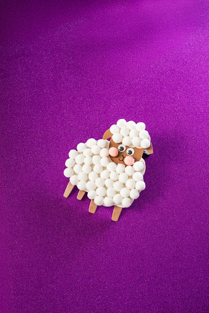 - Folosind lipiciul din pachet, lipește pom-pom-urile peste întreaga suprafață a oiței.