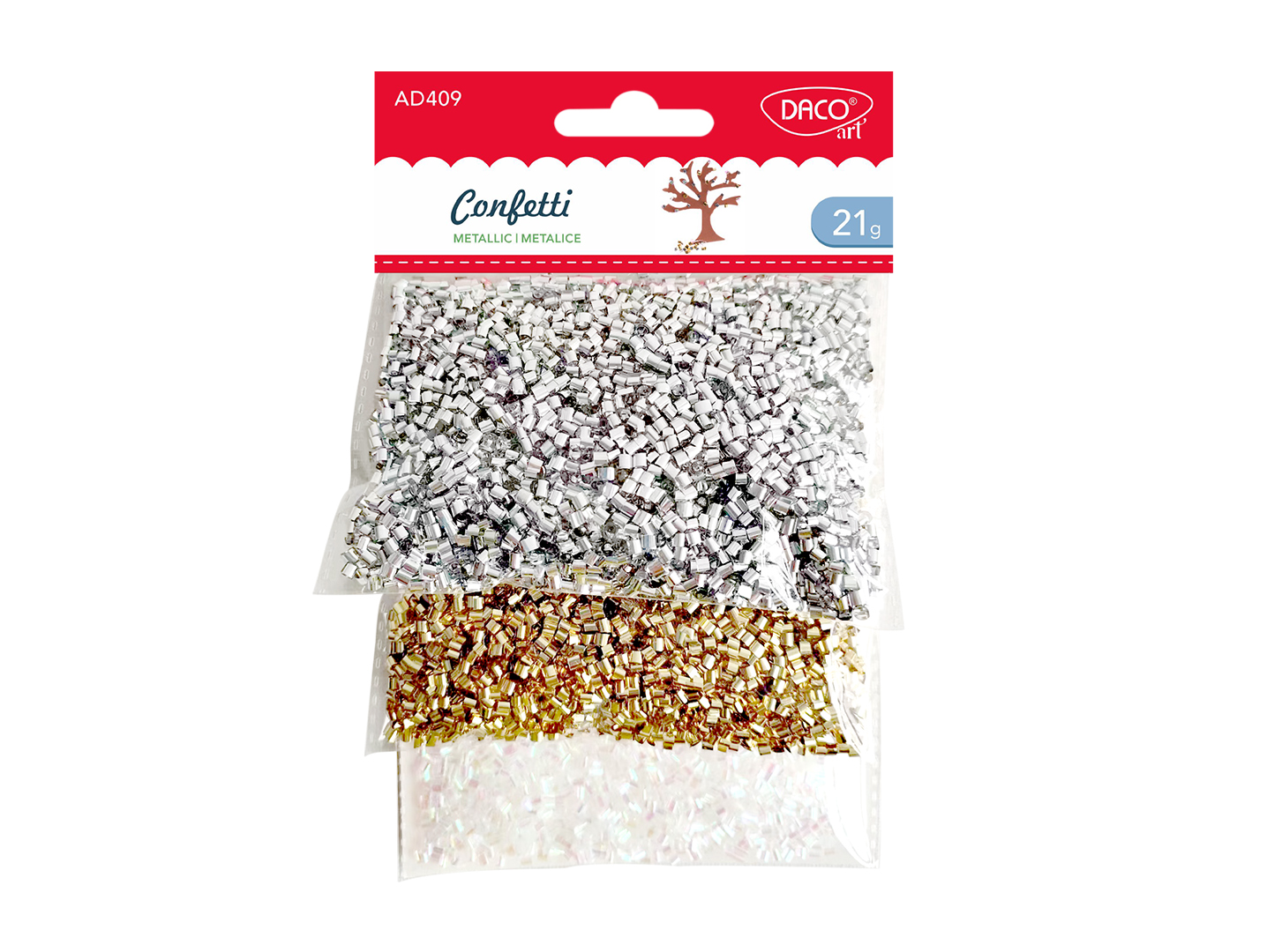 Oferă strălucire și dinamism proiectelor tale cu accesoriile craft Confetti metalice de la DACOart! Acest pachet conține 21 g de confetti strălucitoare, realizate din folie plastic de calitate, perfecte pentru decorarea diverselor lucrări creative.