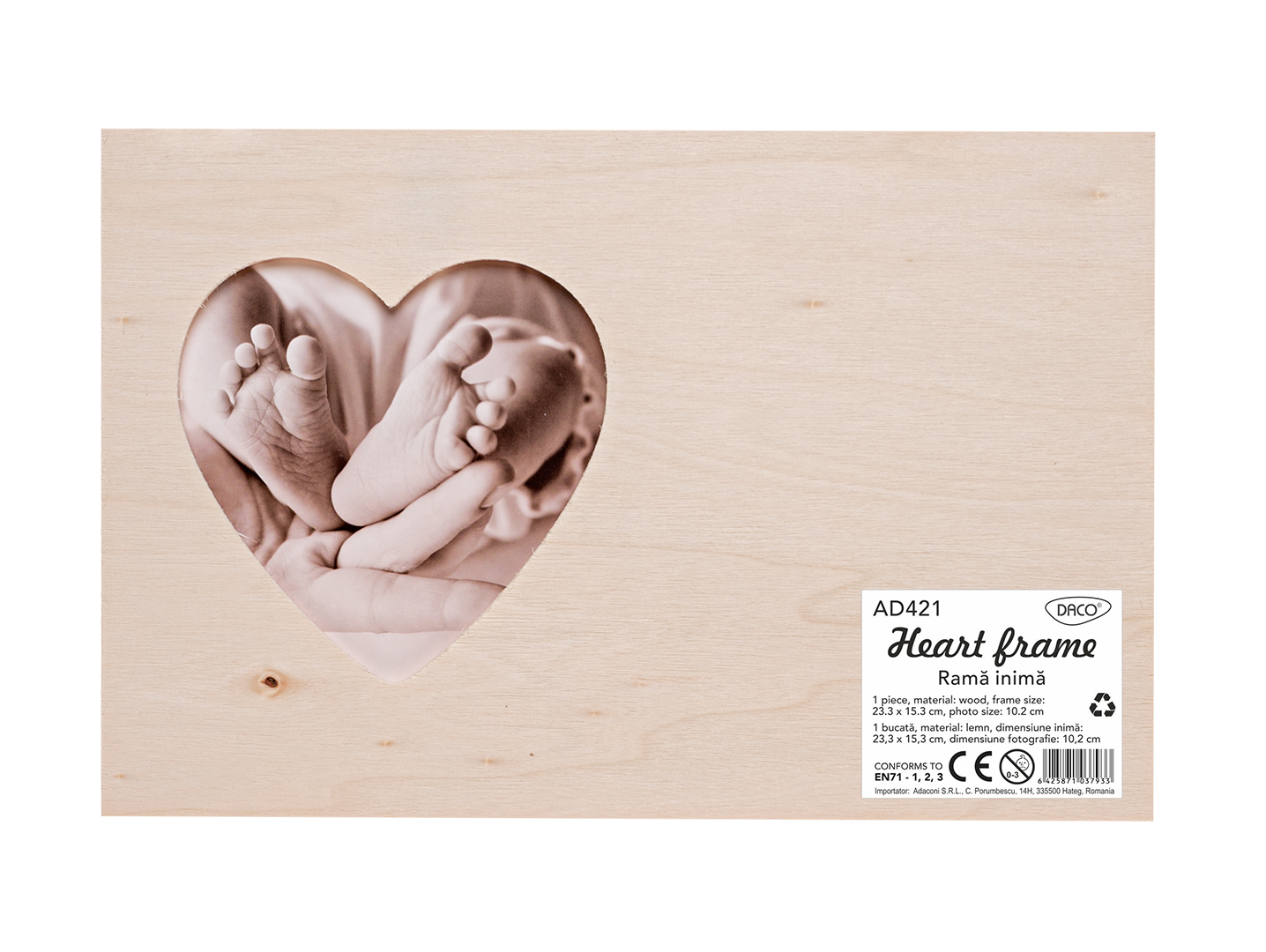 Păstrează momentele speciale aproape cu rama inimă de la DACOart! Acest accesoriu decorativ este perfect pentru a evidenția fotografiile tale preferate și pentru a adăuga un strop de căldură și creativitate decorului tău. Această ramă din lemn poate fi personalizată după bunul tău plac.