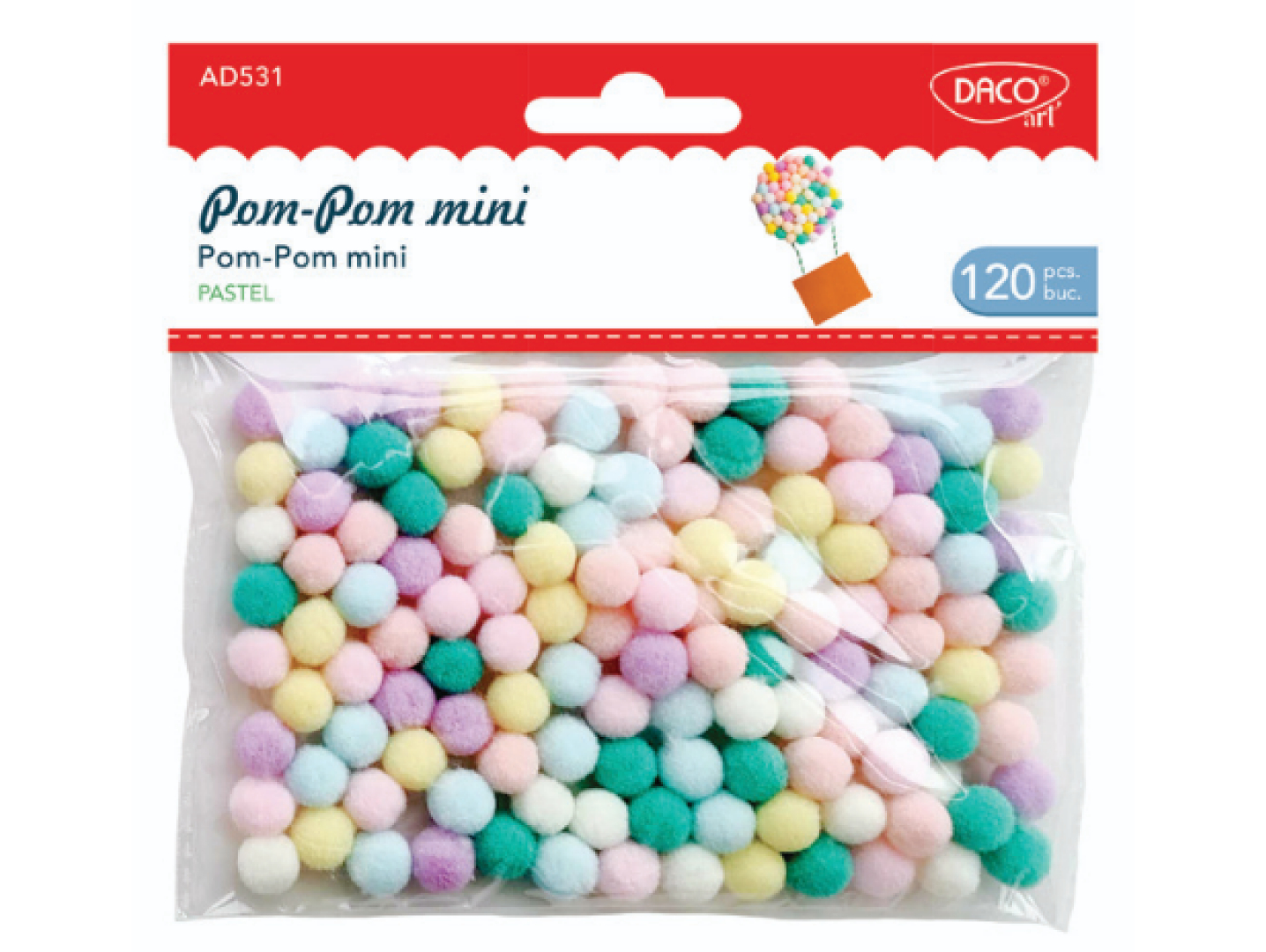 Setul de pom-pom mini DACO AD531 conține 120 de bucăți în culori pastel, perfecte pentru proiecte creative, activități DIY, decorațiuni tematice, felicitări sau lucrări hand-made realizate acasă, la școală sau la grădiniță.