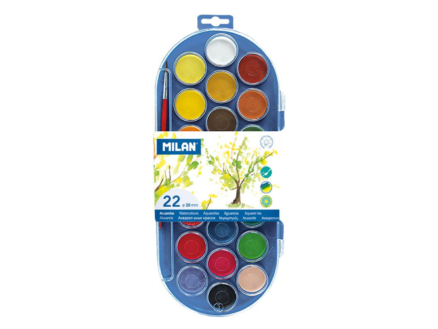 Acuarele 22 culori MILAN – pastile 30 mm cu pensulă inclusă