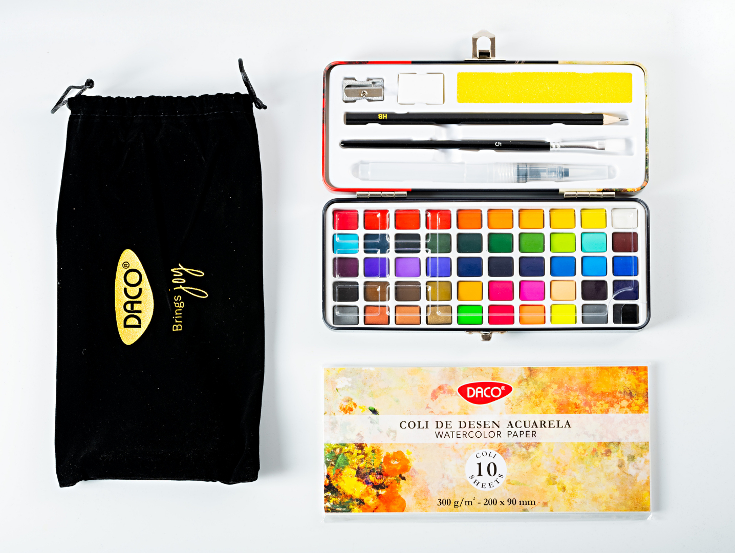 Setul de acuarele DACO AR050 conține 50 de pastile de culoare cu pigment intens, organizate într-o cutie metalică rezistentă, protejată de o husă din catifea. Setul include toate accesoriile necesare pentru pictură în acuarelă: două pensule (una clasică și una cu rezervor de apă), burete, radieră, ascuțitoare, creion grafit, diagramă de culori și 10 coli de desen.