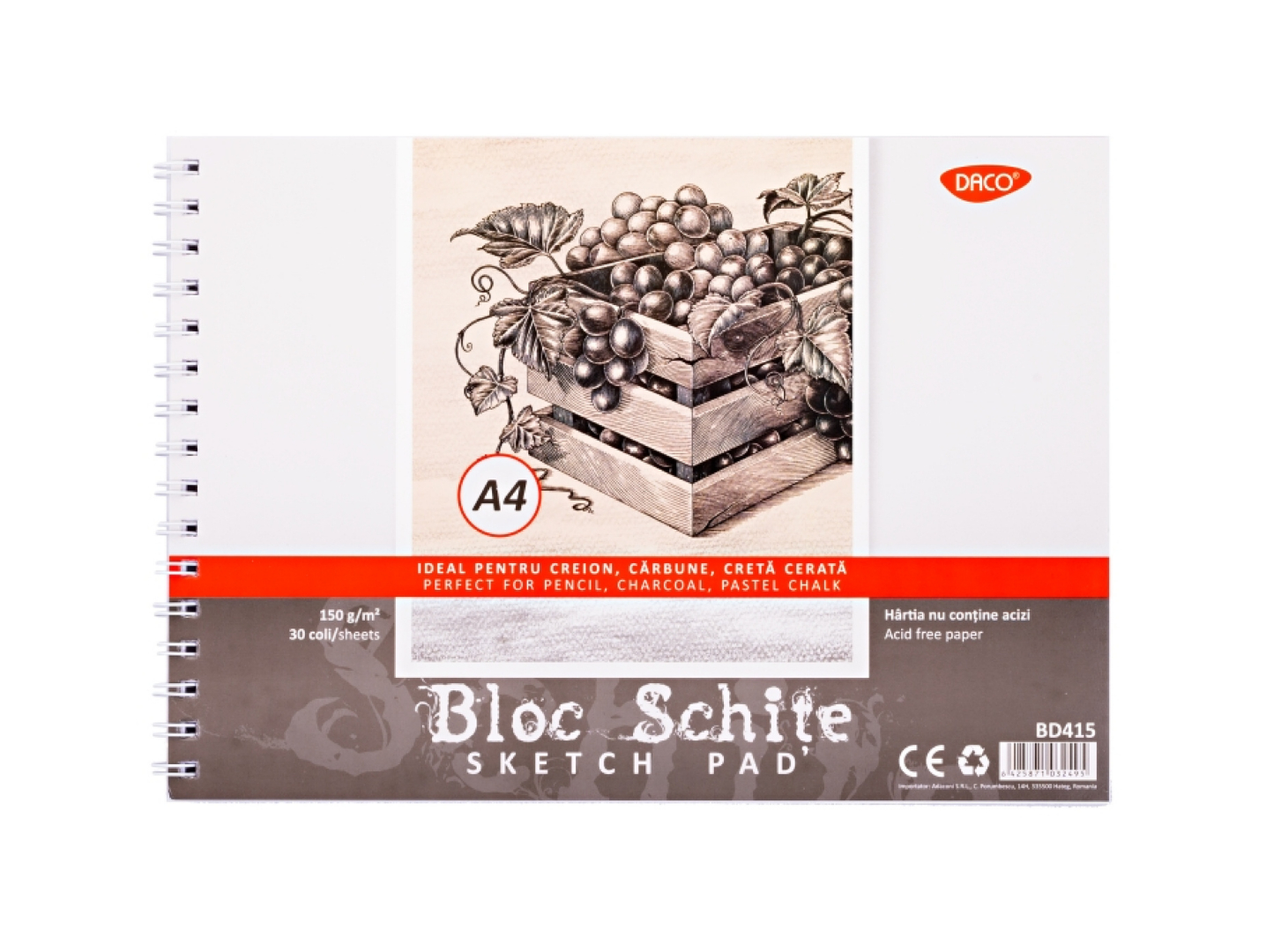 Blocul de schițe DACO A4, cu 30 de file de 150 g/mp, este o alegere sigură pentru cei care caută calitate, versatilitate și durabilitate într-un singur produs, ideal pentru exprimarea liberă a creativității.