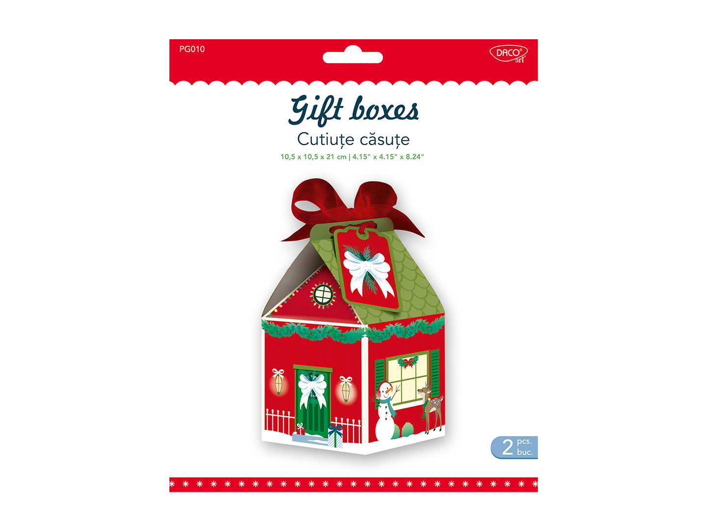 Adaugă un strop de farmec și originalitate cadourilor tale cu Cutiuțele căsuțe de la DACO! Aceste cutii elegante, în formă de căsuță, sunt perfecte pentru a înfrumuseța orice moment special, fie că este vorba despre un cadou de Crăciun, o aniversare sau orice altă ocazie festivă. Fiecare set conține 2 cutii, prevăzute cu panglică, care adaugă un plus de rafinament.