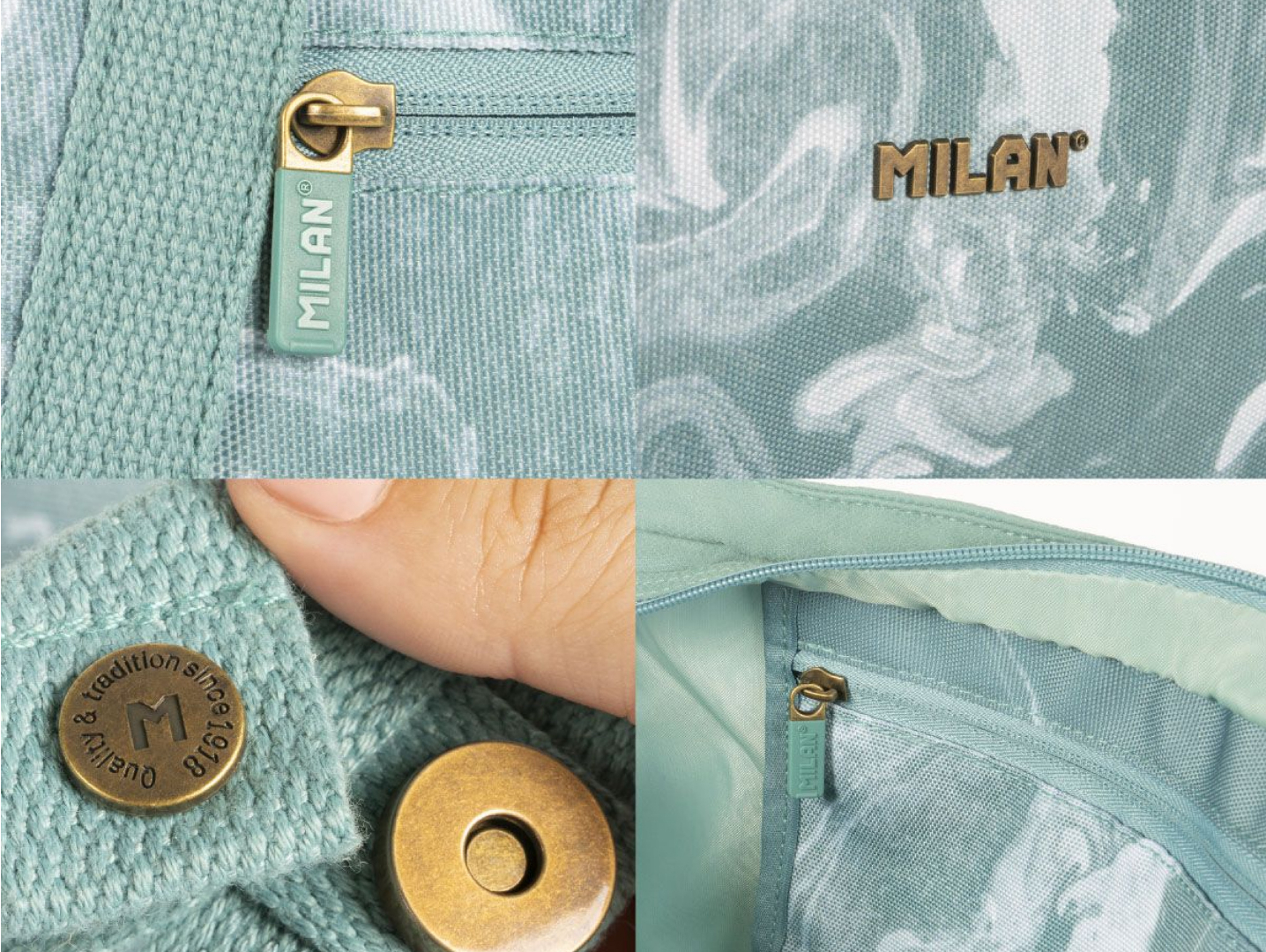 Geanta are un logo metalic MILAN, detaliu care subliniază calitatea și atenția la design.