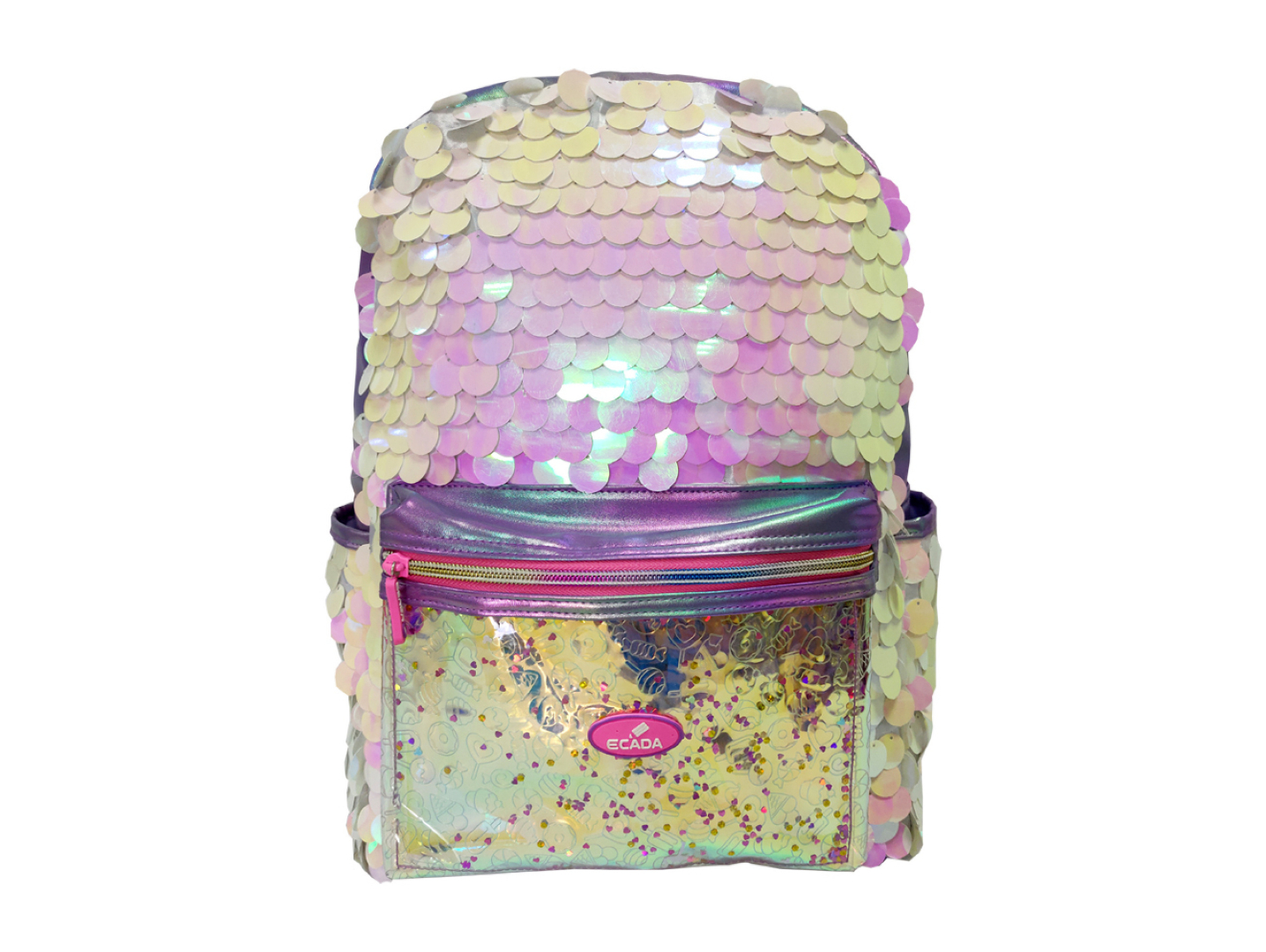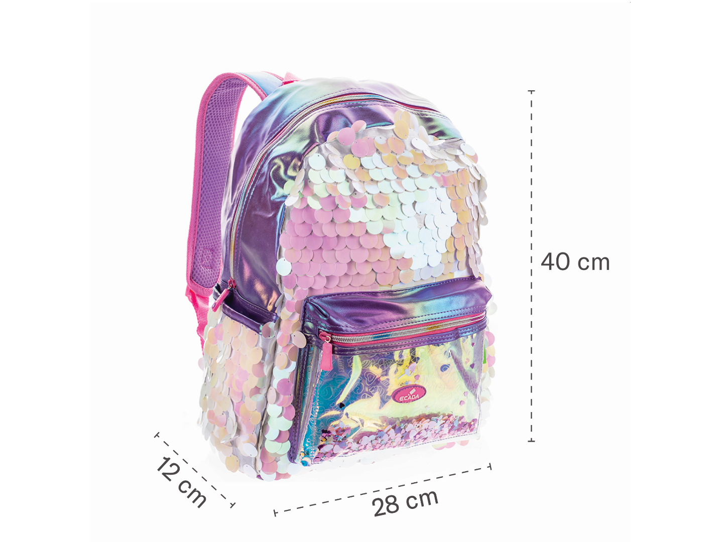 Ghiozdanul școlar ECADA „Mermaid Glow” este alegerea ideală pentru elevele care își doresc un rucsac spectaculos, modern și practic. Designul atrăgător este realizat din paiete strălucitoare cu efect sidefat, în nuanțe delicate de roz, lila și auriu, oferind un look magic, inspirat din lumea sirenelor. Buzunarul frontal transparent, decorat cu elemente colorate, adaugă un plus de originalitate și stil.
