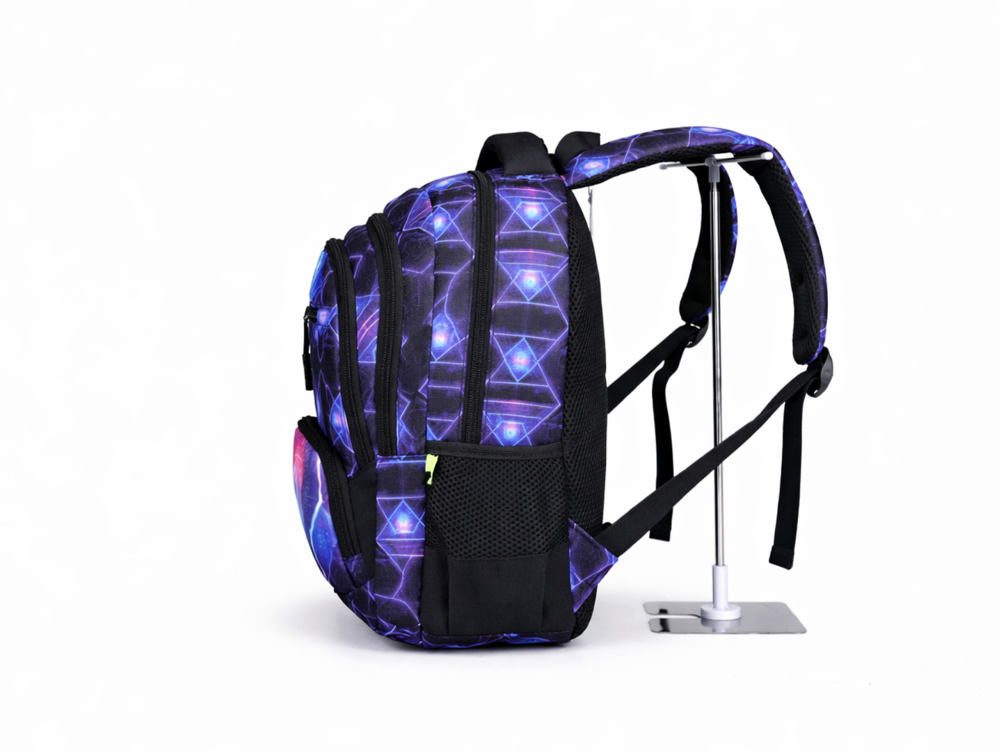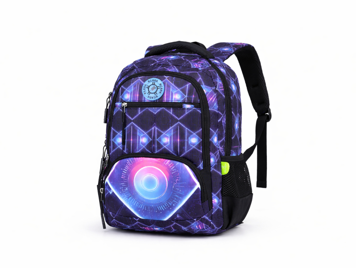 Ghiozdanul școlar ECADA „Neo Vision” este alegerea ideală pentru școlarii pasionați de tehnologie, gaming și design futurist. Cu un aspect modern și captivant, realizat din forme geometrice și efecte vizuale inspirate din lumea digitală, acest ghiozdan iese imediat în evidență. Paleta de culori electrice – albastru, violet și accente roz neon – creează un look energic, perfect pentru copiii care vor să fie diferiți.