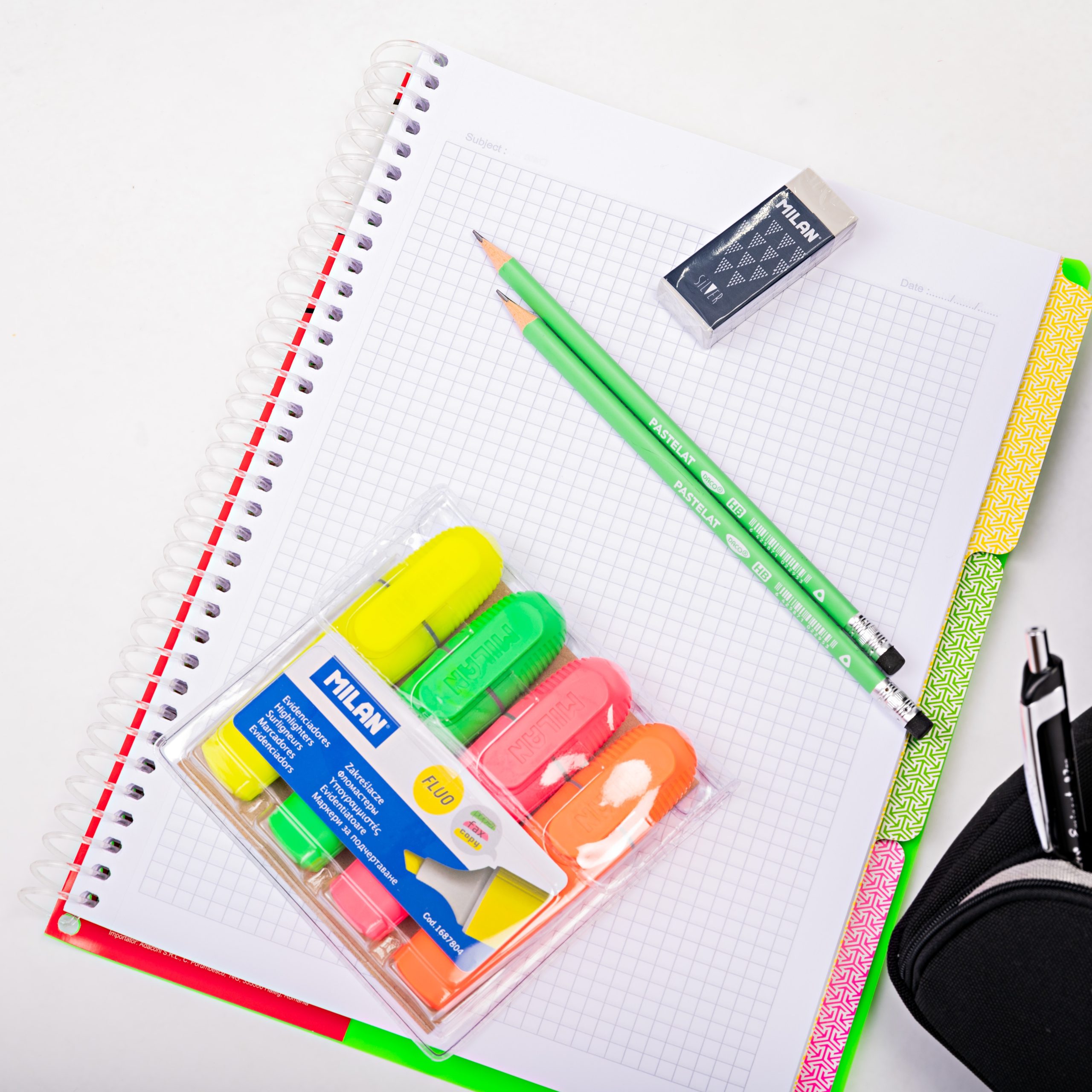 - Setul de markere evidentiator, cu cele patru culori vibrante, iti va ajuta sa subliniezi informatiile importante din materialele de studiu.