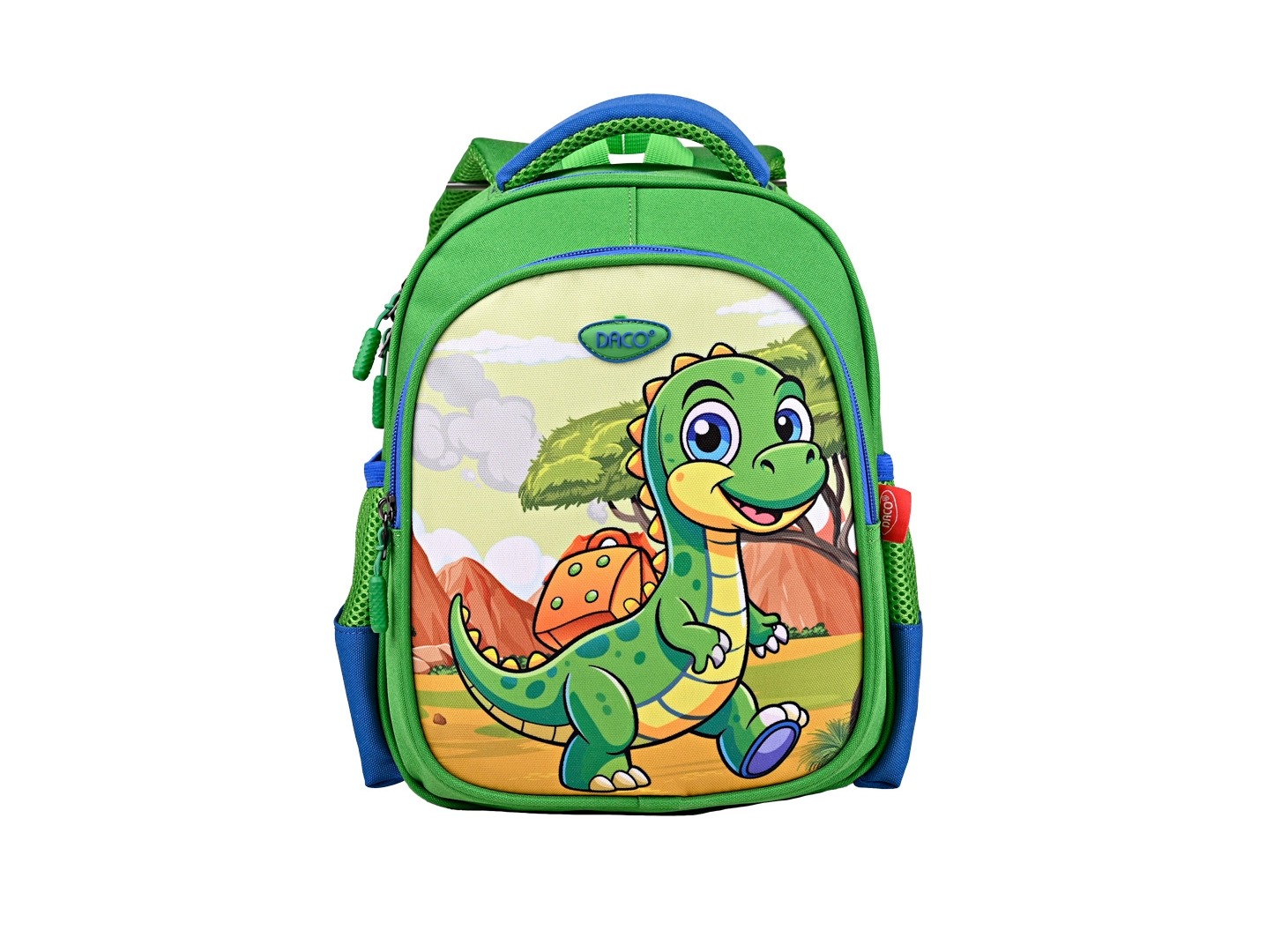 Ghiozdanul DACO „Dino” este alegerea perfectă pentru micii exploratori care pornesc cu entuziasm în aventura grădiniței. Decorat cu un dinozaur prietenos și vesel, în nuanțe atractive de verde, acest ghiozdan aduce un plus de energie și bucurie fiecărei zile.