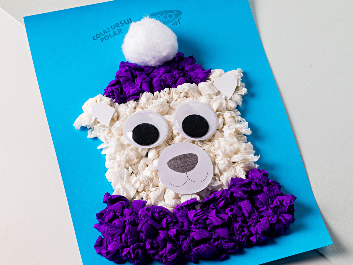 PROIECT 7: Colaj ursul polar – transformă hârtia creponată și câteva detalii simple într-un urs polar adorabil, cu un aspect pufos și vesel, perfect pentru a aduce distracție și creativitate în atmosfera iernii.