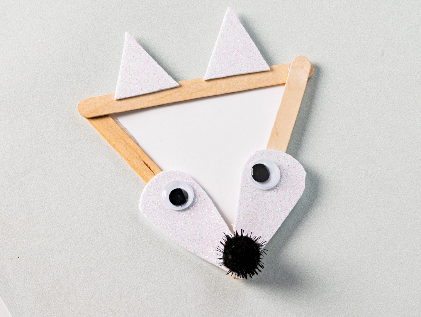 PROIECT 1: Vulpea polară iubăreață – presupune realizarea unei vulpi din bețe de lemn, carton alb, hârtie gumată sclipitoare, ochi lipiți și un pom-pom, pentru un rezultat adorabil și creativ.