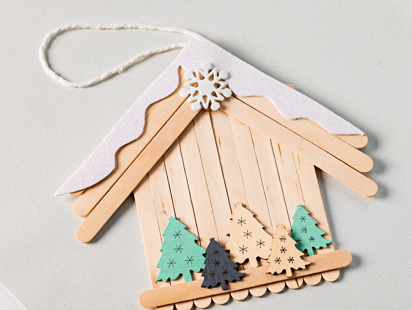 PROIECT 2: Cabana cu brazi – constă în crearea unei cabane de iarnă folosind 10 bețe lipite vertical, 6 pentru acoperiș, hârtie gumată sclipicioasă pentru zăpadă, brazi decorativi, un fulg de nea și o sfoară agățătoare, rezultând un ornament care aduce farmecul iernii în casa ta.