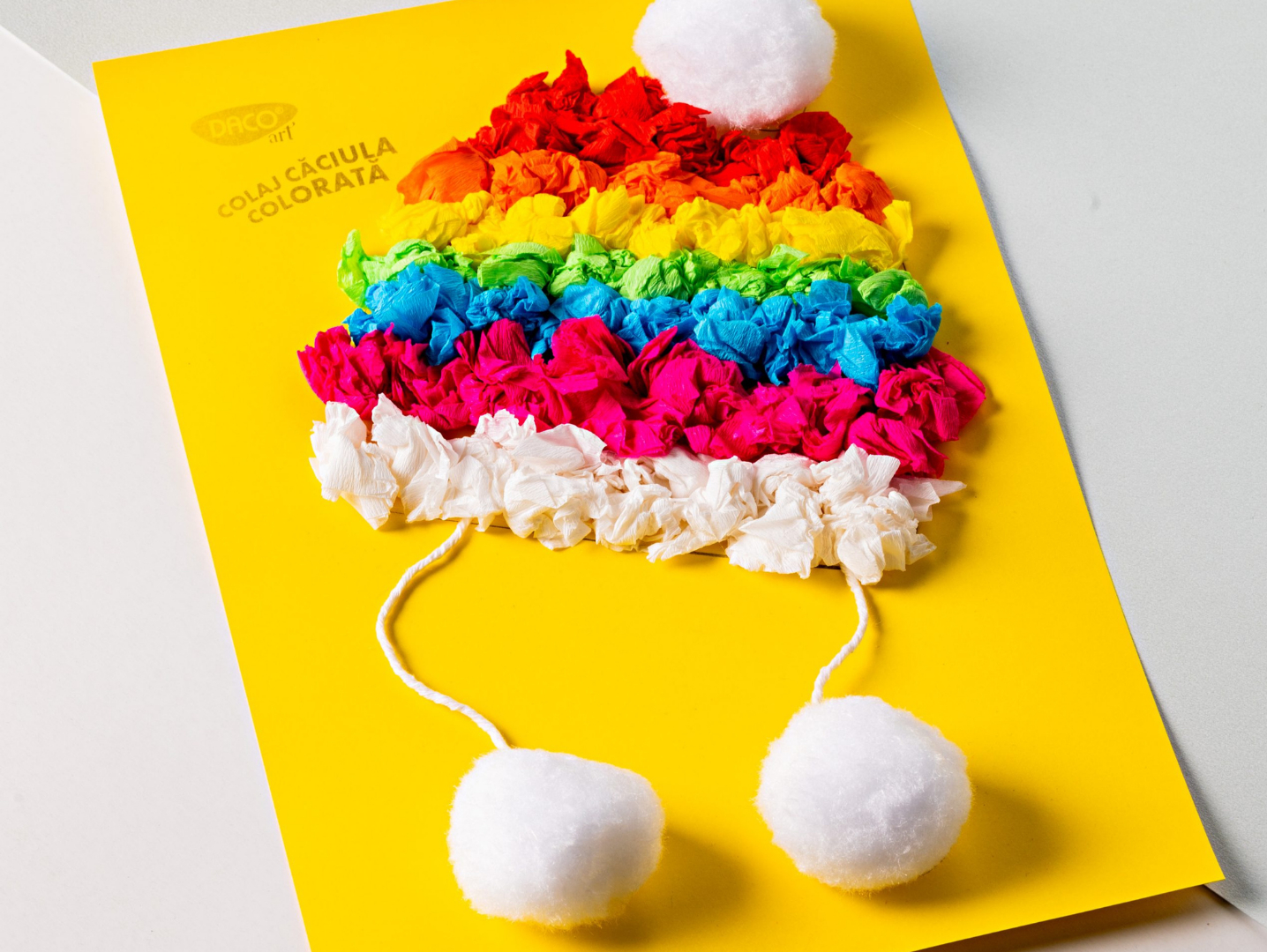 PROIECT 10: Colaj căciula colorată – te inspiră să creezi o căciulă vibrantă și festivă, plină de culori și texturi jucăușe, perfectă pentru a aduce un strop de bucurie și creativitate în zilele reci de iarnă.
