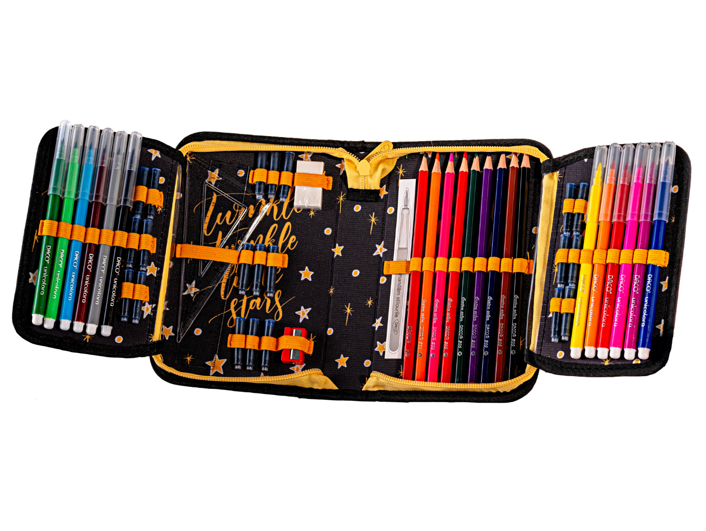Penar școlar echipat DACO – 1 fermoar, 2 extensii, model stele aurii
