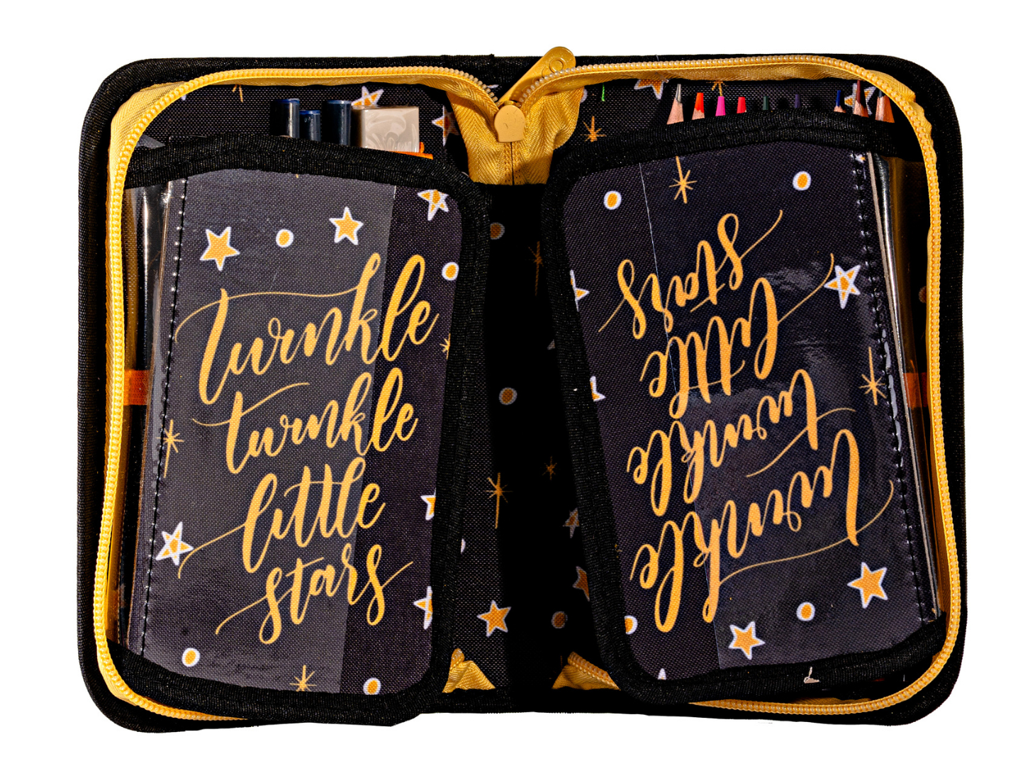 Adaugă un plus de stil și eleganță rechizitelor tale cu penarul DACO model Stele Aurii. Designul modern, în nuanțe de negru cu accente aurii și imprimeu cu stele, oferă un aspect rafinat și atrăgător, potrivit atât pentru fete, cât și pentru băieți.