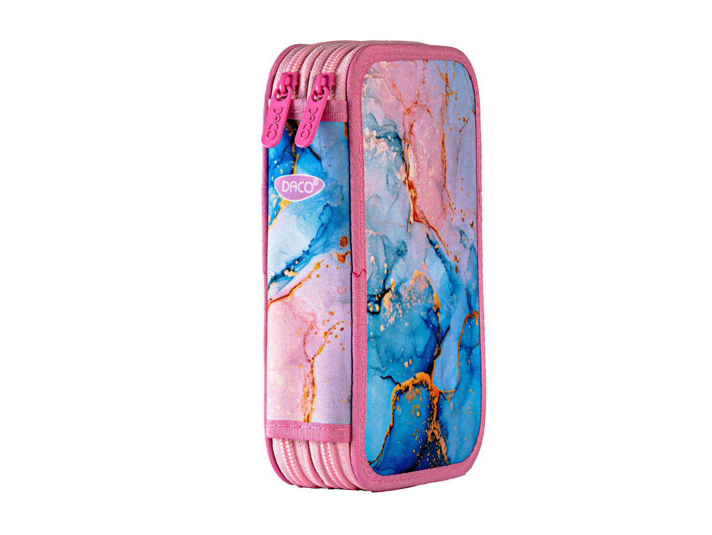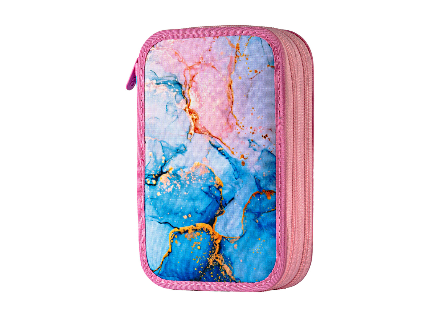 Penarul școlar dublu Marmorat impresionează printr-un design modern, inspirat din textura marmurei, în nuanțe elegante de roz, albastru și accente aurii. Este alegerea ideală pentru elevele care își doresc un penar practic, dar și stilat.