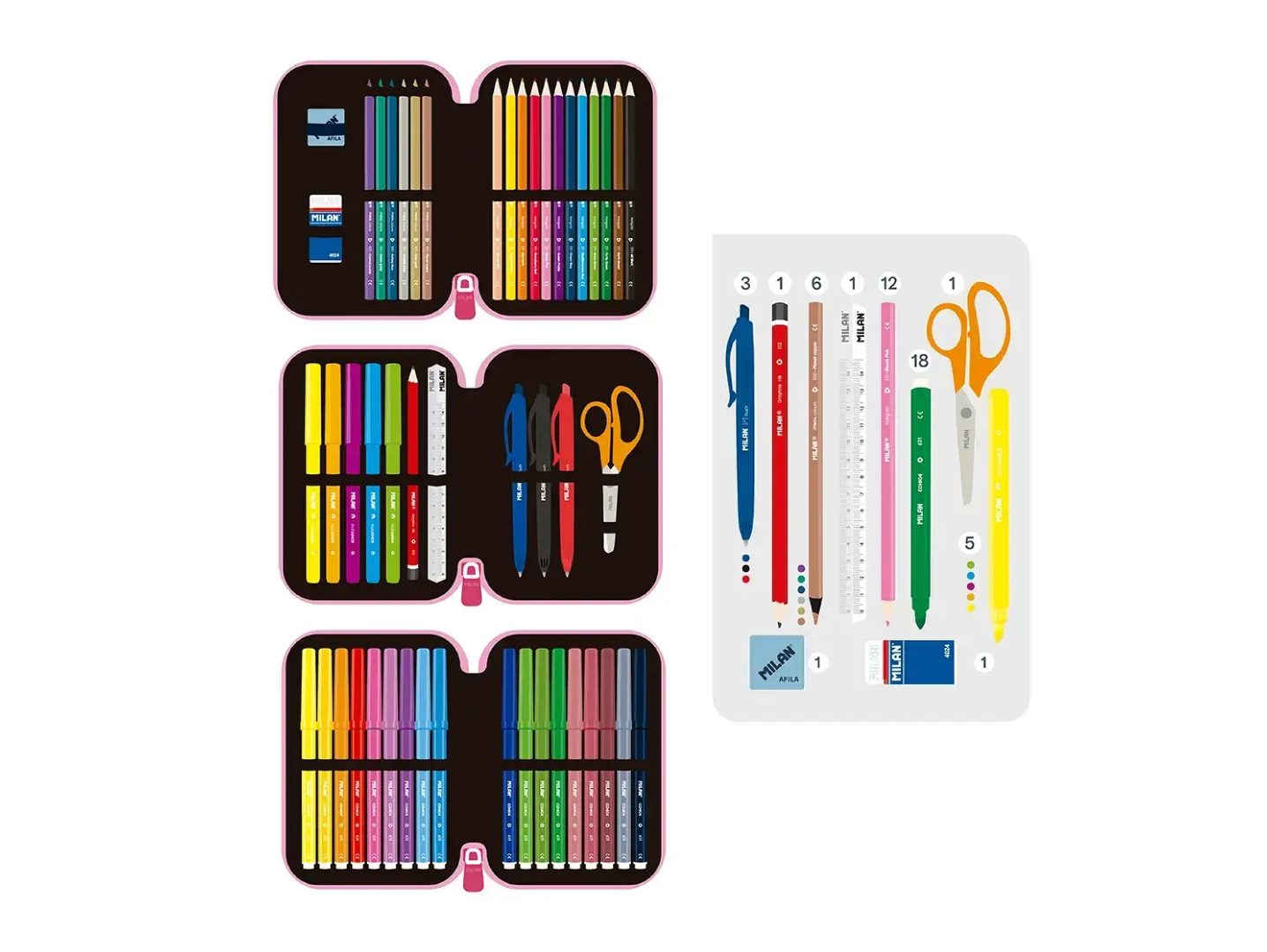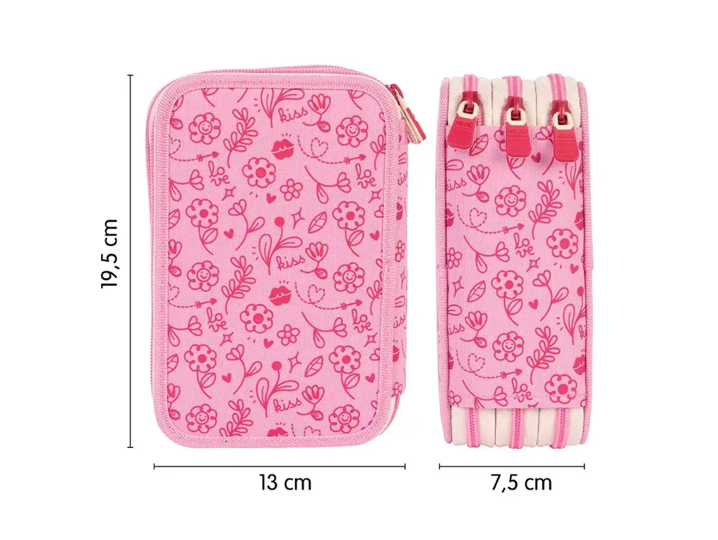 Penar echipat triplu MILAN Flowicorn, în nuanță roz, ideal pentru organizarea completă a rechizitelor școlare. Modelul face parte din colecția specială Flowicorn, decorată cu flori și inimioare în tonuri de roz, inspirând creativitatea și imaginația copiilor.