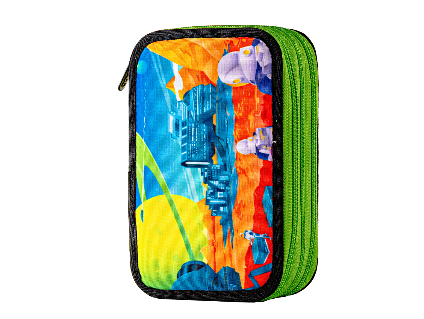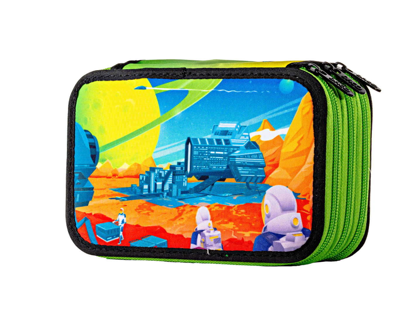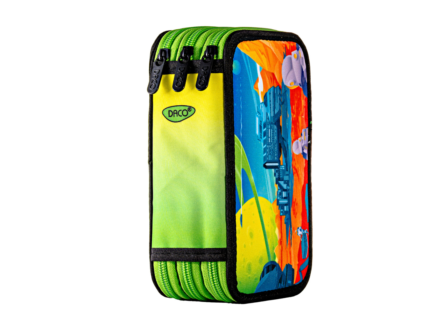 Penar școlar triplu echipat DACO – model Oraș Galactic, 3 compartimente, 46 piese incluse