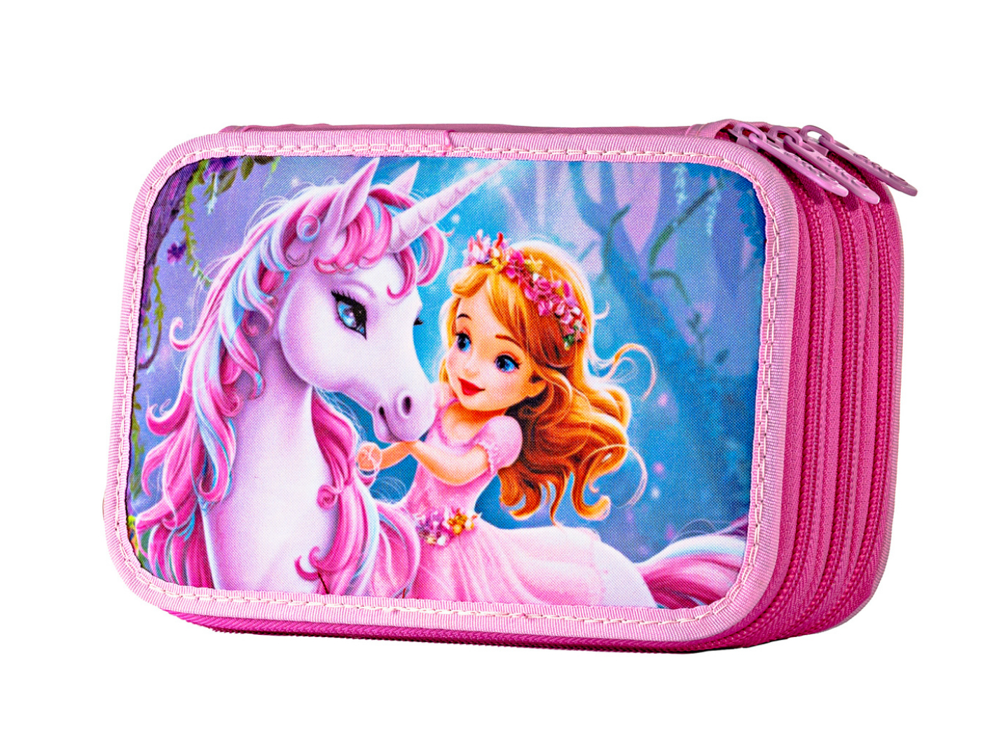 Penarul școlar triplu cu unicorn și prințesă este alegerea ideală pentru fetițele care își doresc un accesoriu practic, bine organizat și cu un design adorabil. Decorat în nuanțe de roz, cu ilustrații atractive cu unicorn și personaj feminin, acest penar îmbină perfect funcționalitatea cu estetica.