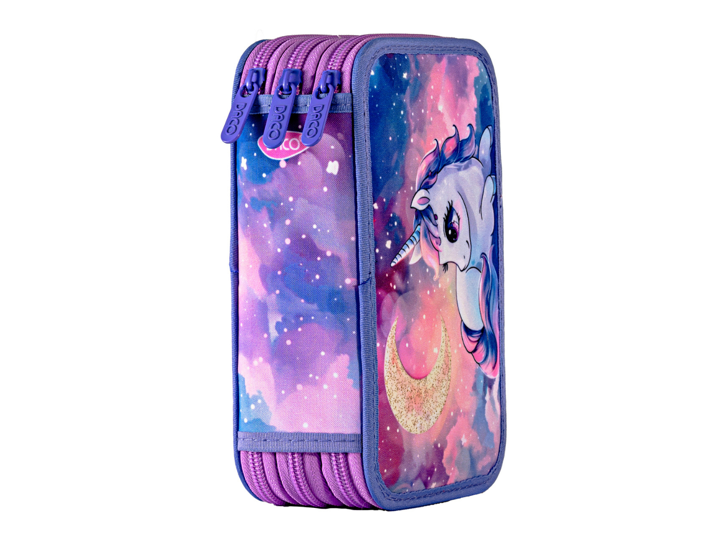 Penar școlar triplu DACO – model Unicorn Magic, 3 compartimente, neechipat, mov