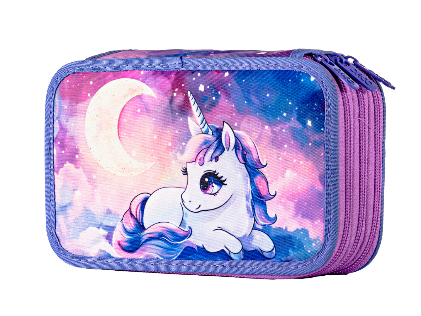 Penarul școlar DACO – Unicorn Magic este alegerea ideală pentru copiii care iubesc lumea magică și culorile pastel. Decorat cu un unicorn adorabil pe un fundal de poveste, cu lună și nori în nuanțe de roz și mov, acest penar adaugă un plus de farmec și creativitate fiecărei zile de școală.