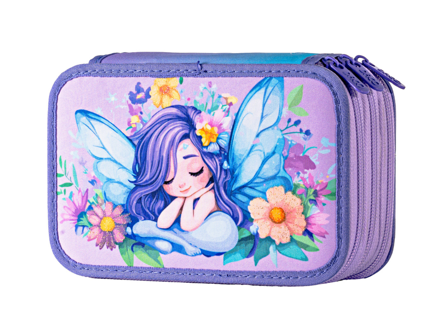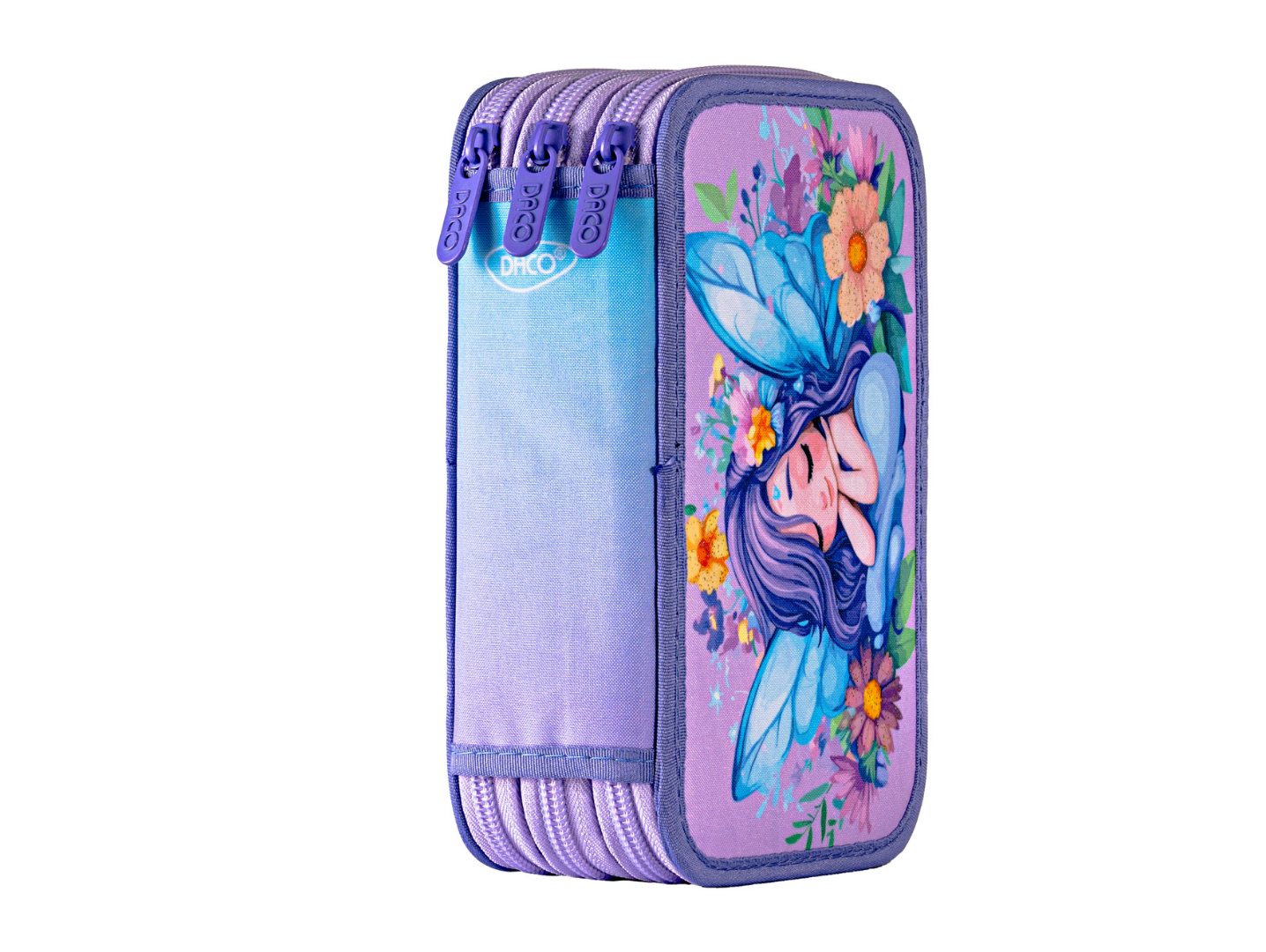 Penar școlar triplu DACO – model zâna florilor, neechipat, 3 compartimente, mov/lila