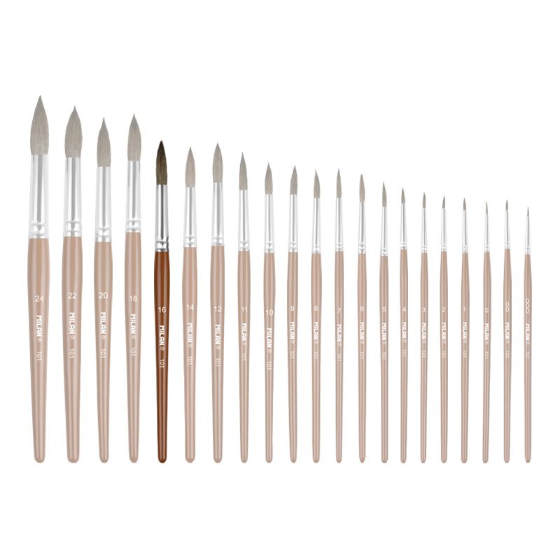 Setul de 6 pensule MILAN seria 101, numărul 16, este ideal pentru aplicații artistice ce necesită acoperire generoasă și un control precis al fluxului de culoare. Cu un vârf rotund și perii de dimensiuni mari, aceste pensule sunt excelente pentru lucrări cu acuarelă, guașă, tempera sau culori pentru postere.
