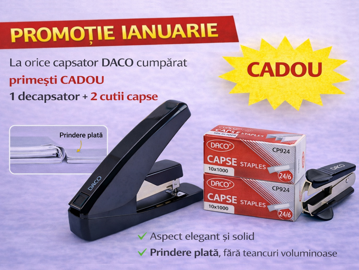 🔥 PROMOȚIE IANUARIE – Capsator DACO CP248 cu prindere plată + Decapsator & 2 cutii capse CADOU!