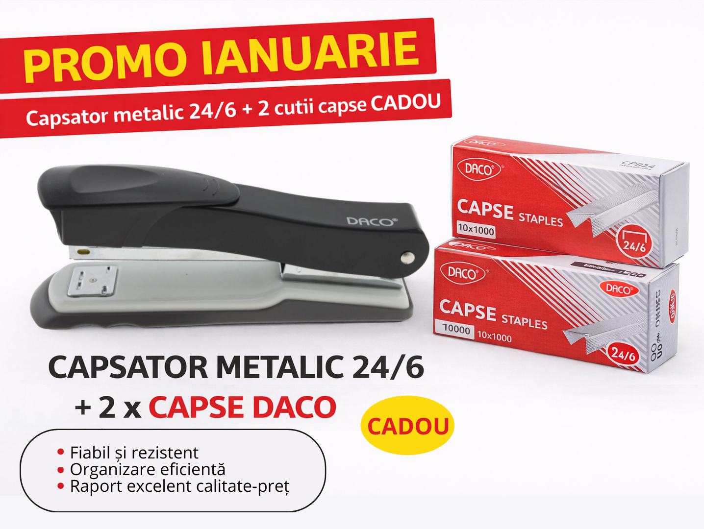 Profită de oferta specială de început de an și echipează-ți biroul cu un set complet, fiabil și avantajos! În cadrul promoției de ianuarie primești un capsator metalic DACO 24/6, împreună cu 2 cutii de capse 24/6 CADOU, ideale pentru utilizare zilnică la birou, școală sau acasă.