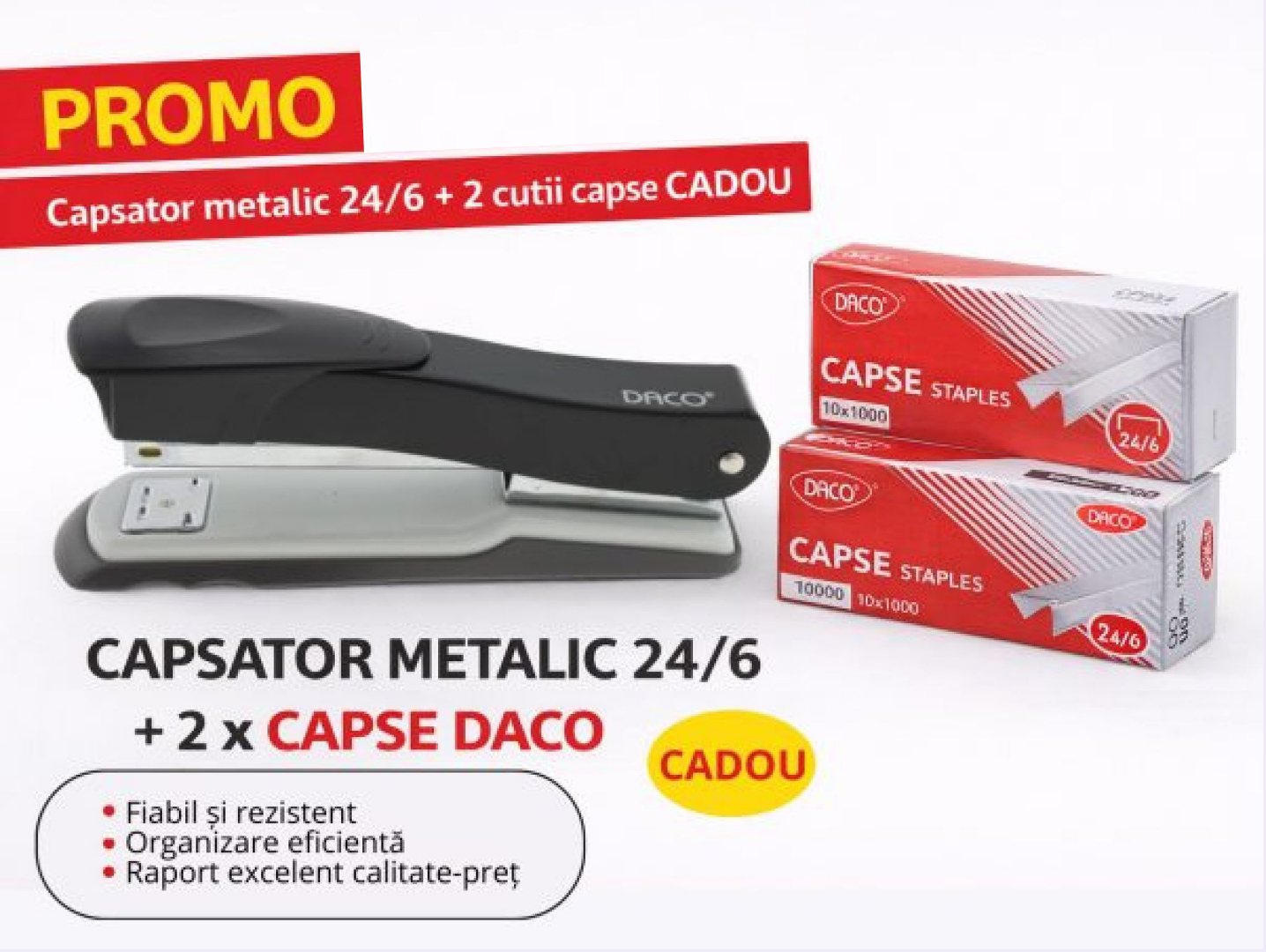 Setul promoțional include 2 cutii de capse DACO 24/6, perfecte pentru utilizarea cu majoritatea capsatoarelor standard de birou.