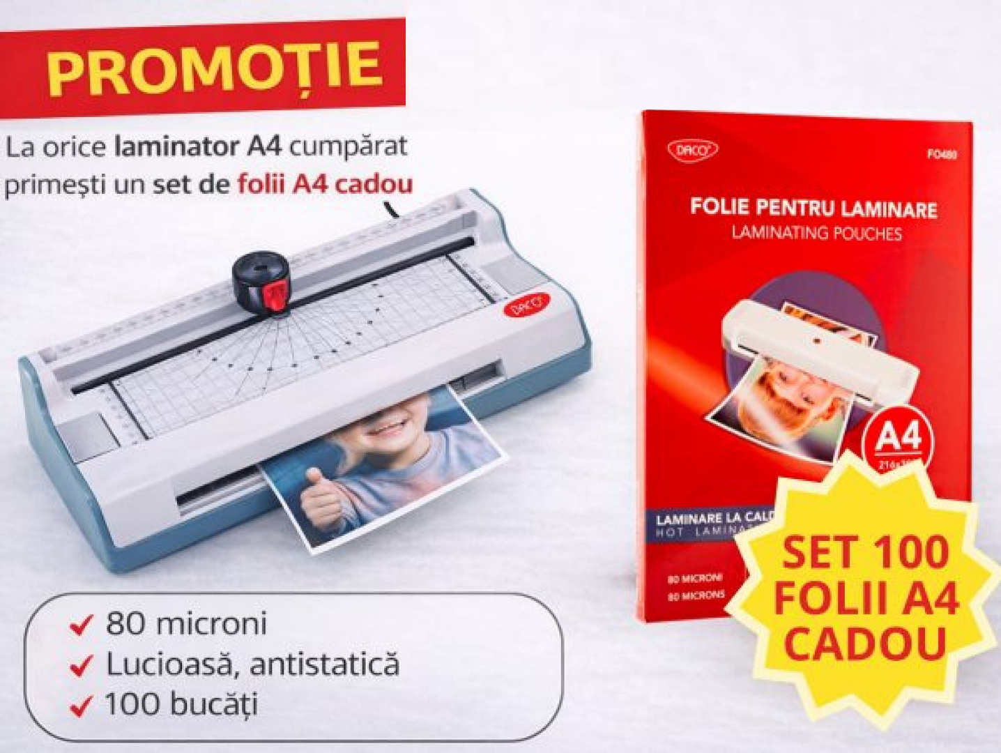 La achiziția oricărui laminator A4 DACO, primești CADOU un set de 100 de folii de laminare A4, 80 microni, lucioase și antistatice – perfecte pentru protecție și prezentare impecabilă.