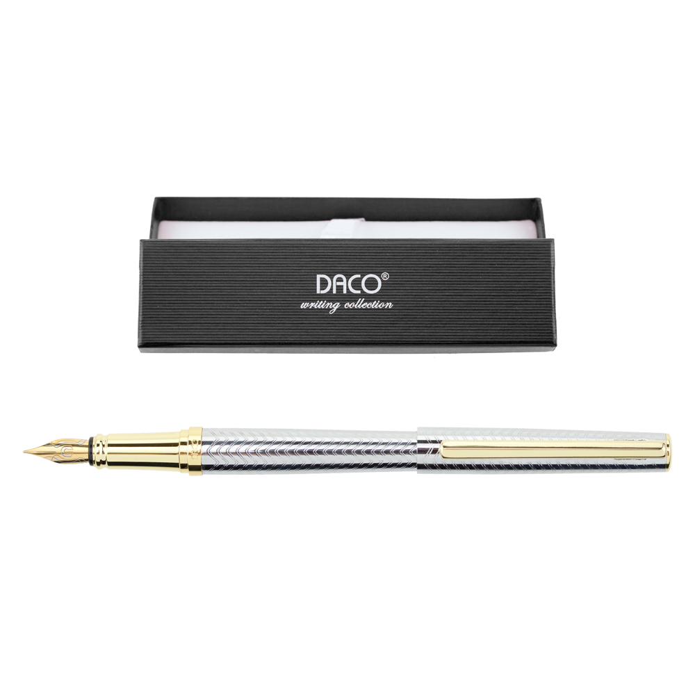Stiloul are corp metalic pentru durabilitate și aspect premium, iar penița tip F (fine) oferă o scriere fină, precisă și confortabilă. Setul include o casetă neagră practică, care poate fi folosită atât pentru păstrarea stiloului, cât și ca penar pentru depozitare.