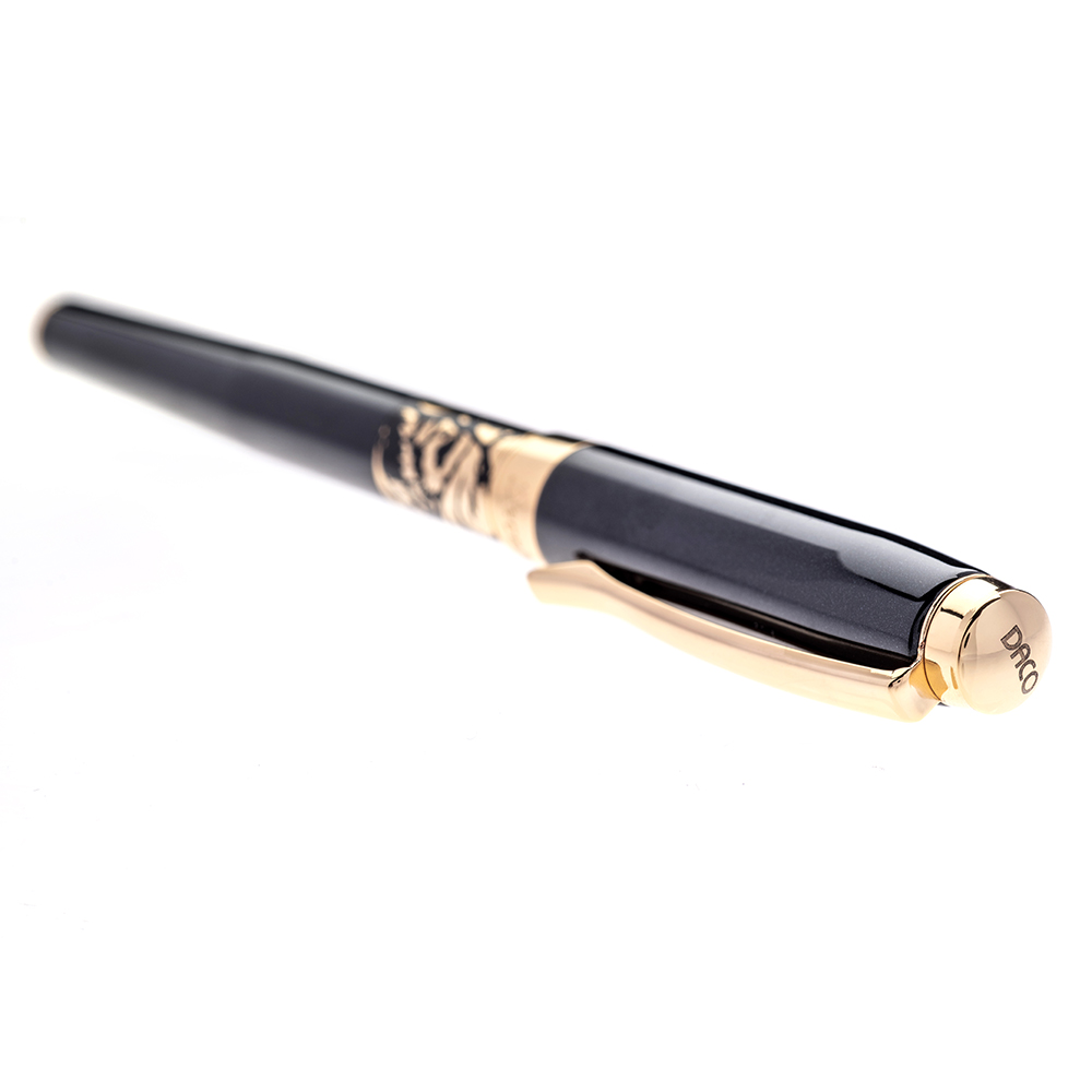 Stilou metalic DACO negru cu decorații aurii, model Decebal, peniță iridium F, compatibil cu patron de cerneală standard. Include casetă elegantă. Design modern inspirat din tradiția dacică, scriere fină și precisă. Ideal pentru școală, birou, cadouri și utilizare profesională.