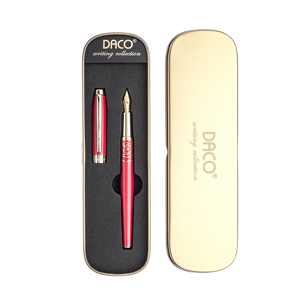 Stilou metalic DACO roșu cu decorații aurii, model Trandafir de la Moldova, peniță iridium F și patron de cerneală standard. Vine într-o casetă elegantă, perfect pentru cadou, birou, școală sau utilizare profesională. Design modern cu elemente tradiționale românești și scriere fină.